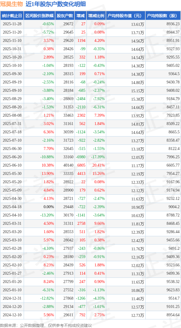 从股价来看,2025年11月20日至2025年11月28日,冠昊生物区间跌幅为0.65%,在此期间股东户数增加27.0户,增幅为0.09%。