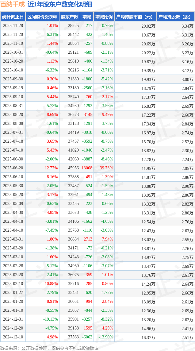 从股价来看,2025年11月20日至2025年11月28日,百纳千成区间涨幅为1.01%,在此期间股东户数减少217.0户,减幅为0.76%。