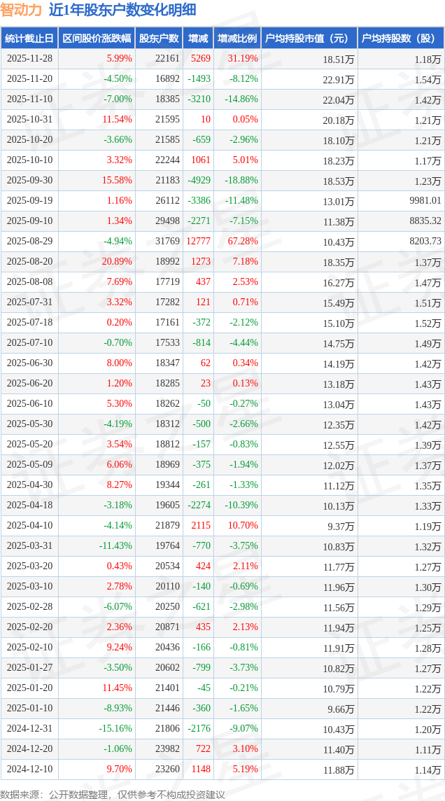 从股价来看,2025年11月20日至2025年11月28日,智动力区间涨幅为5.99%,在此期间股东户数增加5269.0户,增幅为31.19%。