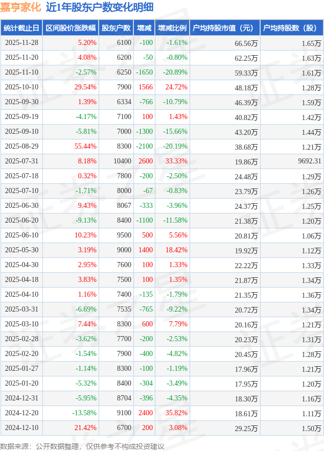 从股价来看,2025年11月20日至2025年11月28日,嘉亨家化区间涨幅为5.2%,在此期间股东户数减少100.0户,减幅为1.61%。
