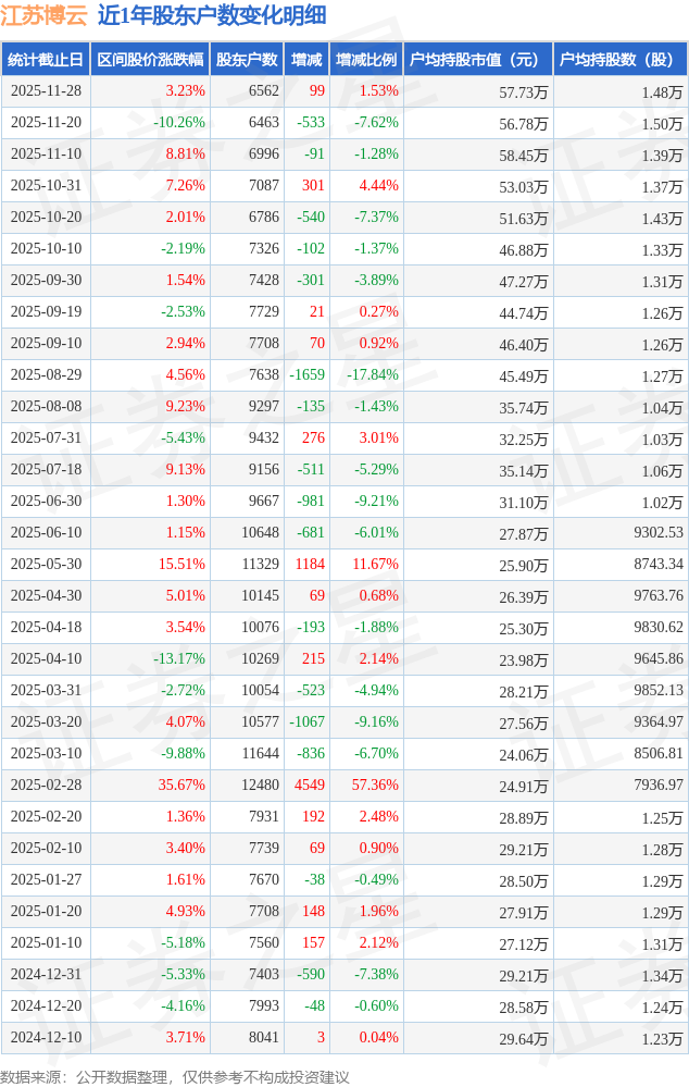 从股价来看,2025年11月20日至2025年11月28日,江苏博云区间涨幅为3.23%,在此期间股东户数增加99.0户,增幅为1.53%。