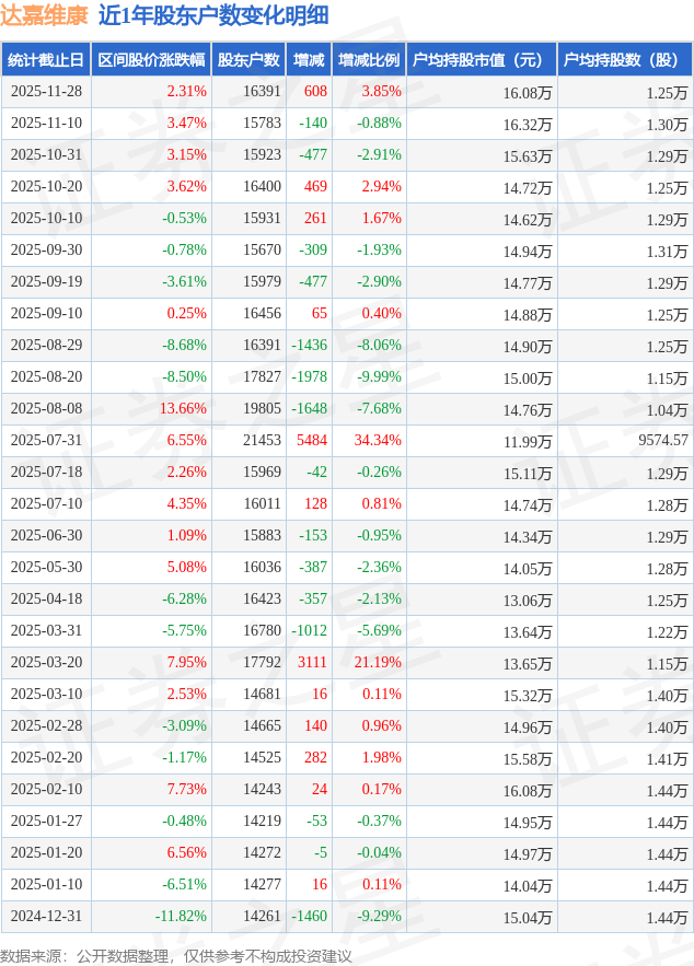 从股价来看,2025年11月10日至2025年11月28日,达嘉维康区间涨幅为2.31%,在此期间股东户数增加608.0户,增幅为3.85%。