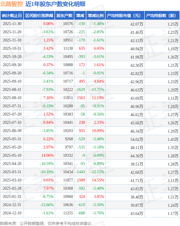 从股价来看,2025年11月20日至2025年11月30日,北路智控区间涨幅为0.06%,在此期间股东户数减少150.0户,减幅为1.4%。