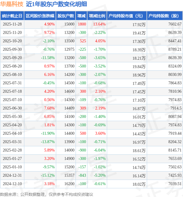 从股价来看,2025年11月20日至2025年11月28日,华是科技区间涨幅为4.9%,在此期间股东户数增加1800.0户,增幅为13.64%。