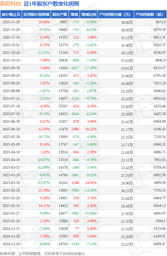 从股价来看,2025年11月20日至2025年11月28日,凯旺科技区间涨幅为18.04%,在此期间股东户数减少715.0户,减幅为6.69%。