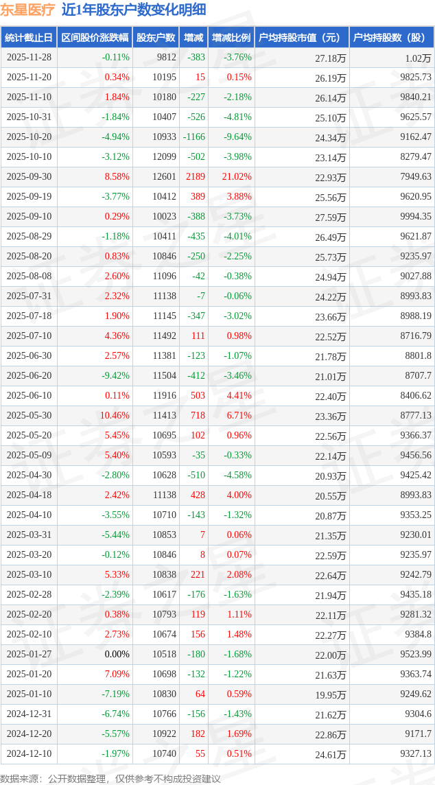 从股价来看,2025年11月20日至2025年11月28日,东星医疗区间跌幅为0.11%,在此期间股东户数减少383.0户,减幅为3.76%。