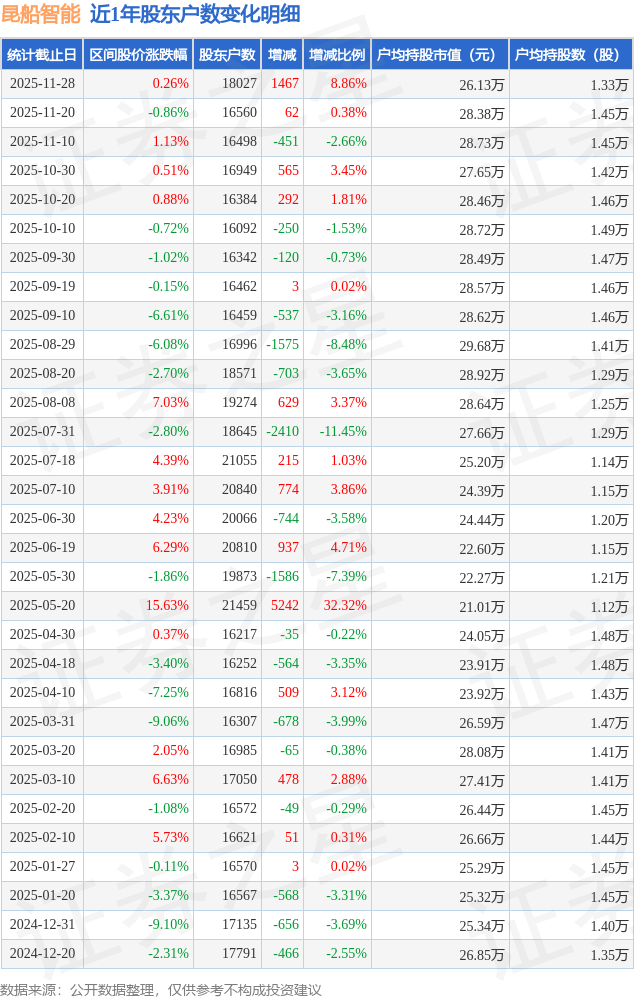 从股价来看,2025年11月20日至2025年11月28日,昆船智能区间涨幅为0.26%,在此期间股东户数增加1467.0户,增幅为8.86%。