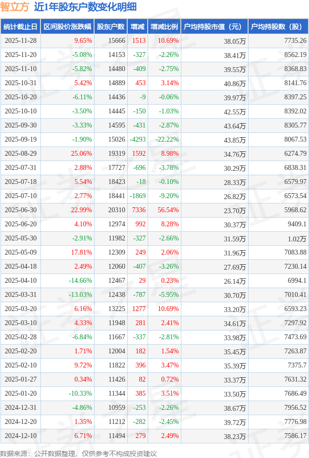 从股价来看,2025年11月20日至2025年11月28日,智立方区间涨幅为9.65%,在此期间股东户数增加1513.0户,增幅为10.69%。