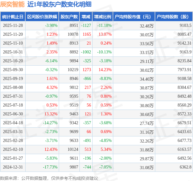 从股价来看,2025年11月20日至2025年11月28日,辰奕智能区间跌幅为3.98%,在此期间股东户数减少1127.0户,减幅为11.18%。