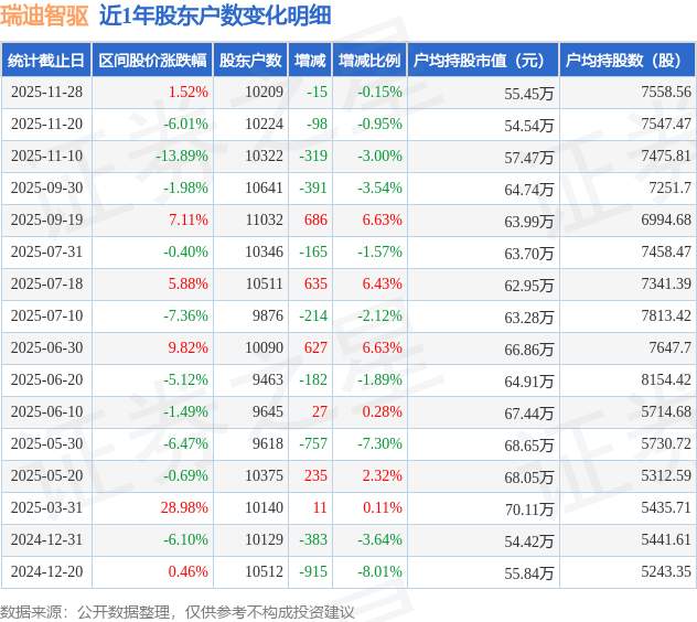 从股价来看,2025年11月20日至2025年11月28日,瑞迪智驱区间涨幅为1.52%,在此期间股东户数减少15.0户,减幅为0.15%。