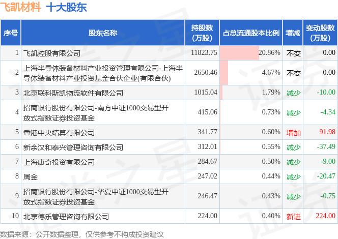 根据飞凯材料2025年三季报公布的十大股东详情如下: