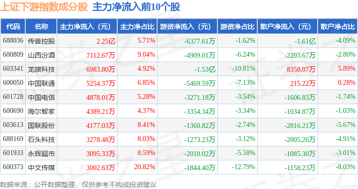 资金流向方面,上证下游(000096)指数成份股当日主力资金净流出合计34.49亿元,游资资金净流入合计9.75亿元,散户资金净流入合计24.74亿元。成份股资金流向详情见下表: