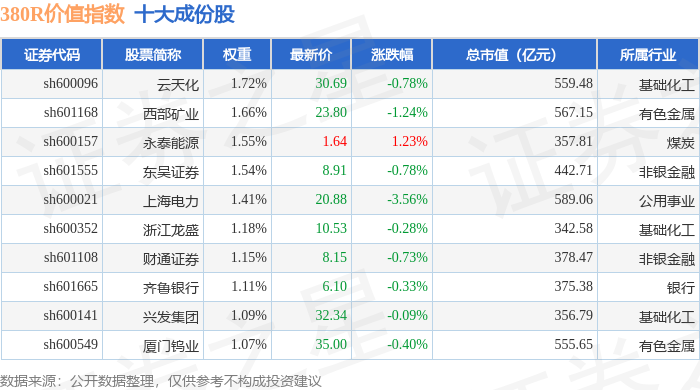 380R价值(000120)指数十大成份股详情如下: