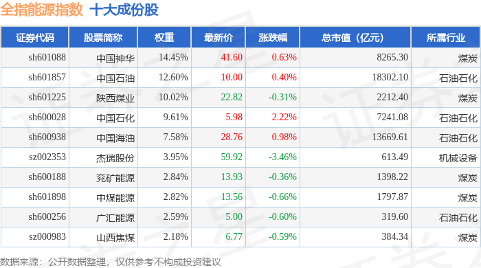 全指能源(000986)指数十大成份股详情如下: