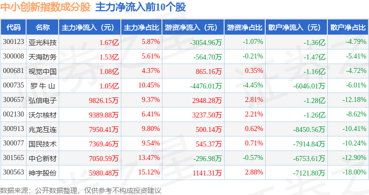资金流向方面,中小创新(399015)指数成份股当日主力资金净流出合计74.42亿元,游资资金净流入合计15.26亿元,散户资金净流入合计59.16亿元。成份股资金流向详情见下表: