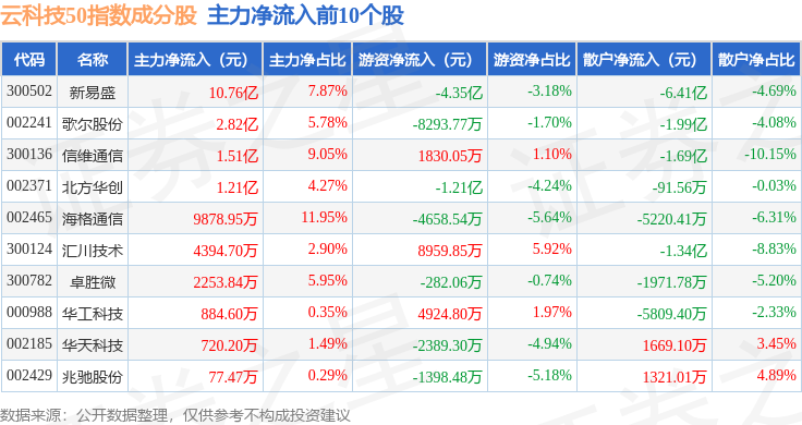 资金流向方面,云科技50(399279)指数成份股当日主力资金净流出合计55.74亿元,游资资金净流入合计18.68亿元,散户资金净流入合计37.06亿元。成份股资金流向详情见下表: