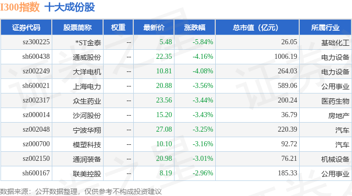 I300(399416)指数十大成份股详情如下: