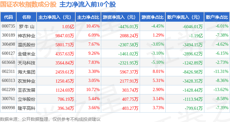 资金流向方面,国证农牧(399435)指数成份股当日主力资金净流出合计9893.4万元,游资资金净流入合计1.56亿元,散户资金净流出合计5731.36万元。成份股资金流向详情见下表: