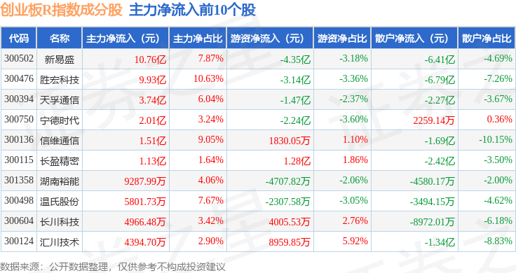 资金流向方面,创业板R(399606)指数成份股当日主力资金净流出合计39.79亿元,游资资金净流入合计5.8亿元,散户资金净流入合计33.99亿元。成份股资金流向详情见下表:
