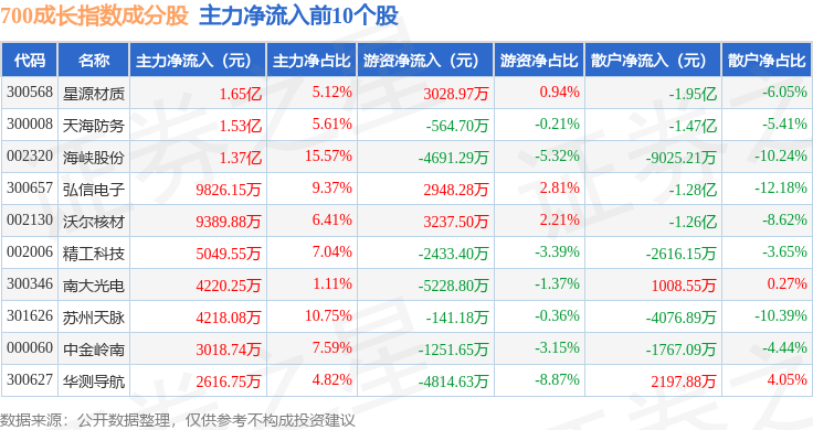 资金流向方面,700成长(399628)指数成份股当日主力资金净流出合计53.23亿元,游资资金净流入合计12.04亿元,散户资金净流入合计41.19亿元。成份股资金流向详情见下表: