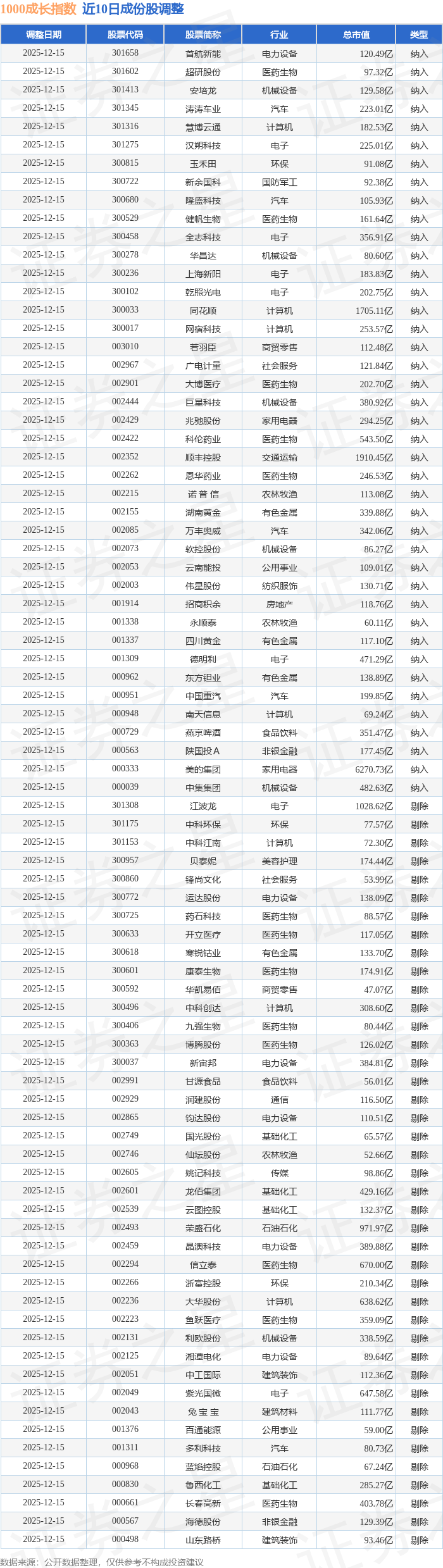 近10日内1000成长(399630)指数成份股做了调整,新纳入了41只股票,剔除了41只股票。
