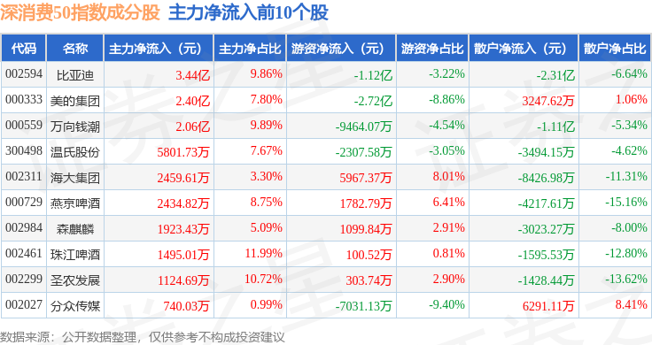 资金流向方面,深消费50(399646)指数成份股当日主力资金净流出合计23.7亿元,游资资金净流入合计9955.74万元,散户资金净流入合计22.71亿元。成份股资金流向详情见下表: