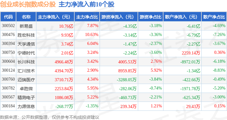 资金流向方面,创业成长(399667)指数成份股当日主力资金净流出合计22.84亿元,游资资金净流出合计6458.49万元,散户资金净流入合计23.48亿元。成份股资金流向详情见下表: