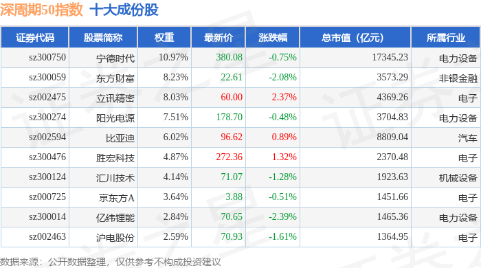 证券之星消息,12月2日,深周期50(399670)指数报收于4179.39点,跌0.68%,成交811.75亿元,换手率0.98%。当日该指数成份股中,上涨的有8家,立讯精密以2.37%的涨幅领涨,下跌的有41家,天齐锂业以3.68%的跌幅领跌。