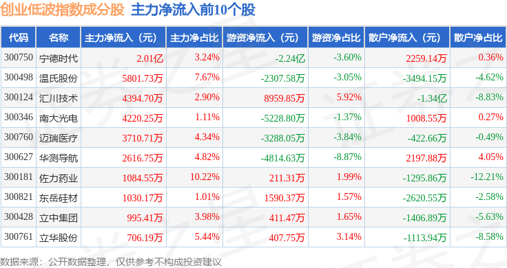 资金流向方面,创业低波(399692)指数成份股当日主力资金净流出合计9.25亿元,游资资金净流出合计3566.64万元,散户资金净流入合计9.6亿元。成份股资金流向详情见下表: