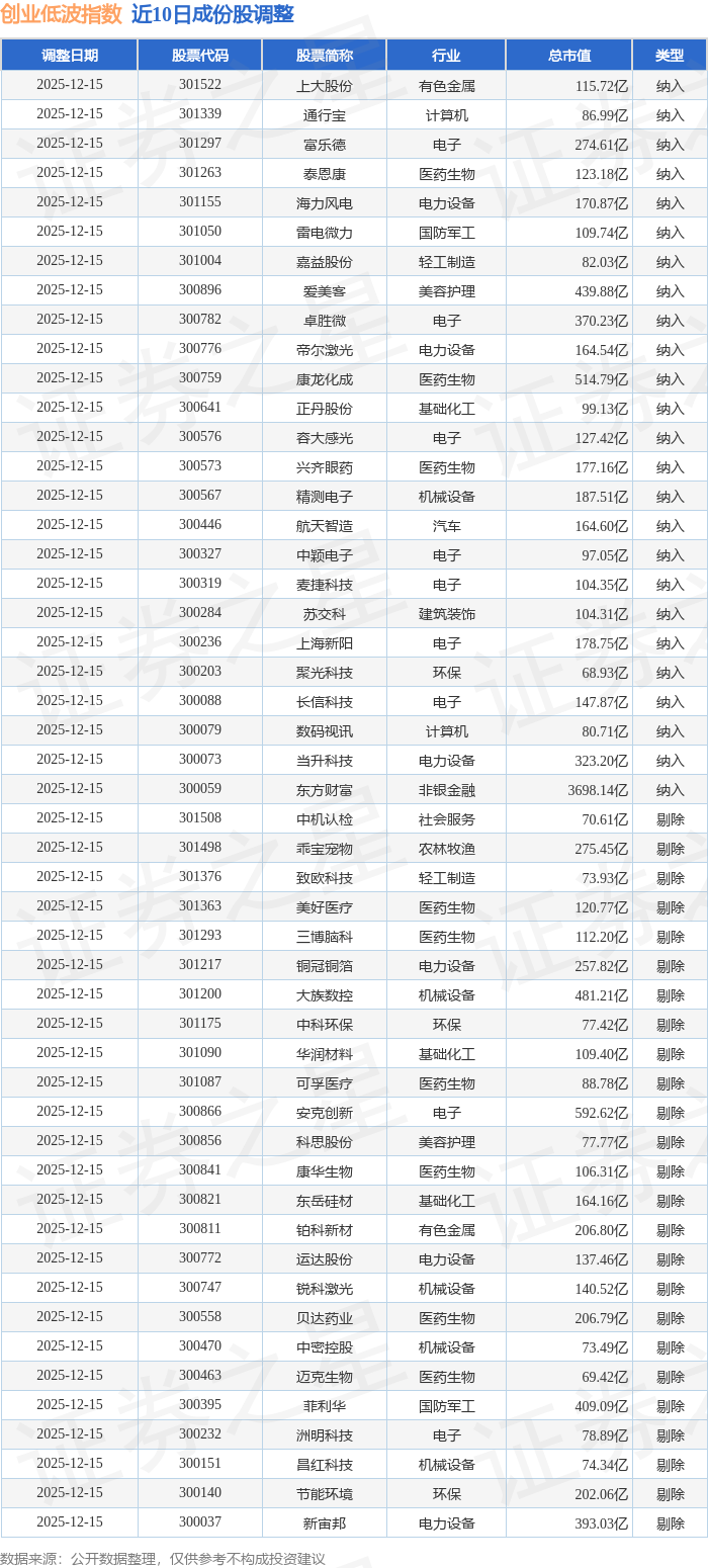 近10日内创业低波(399692)指数成份股做了调整,新纳入了25只股票,剔除了25只股票。