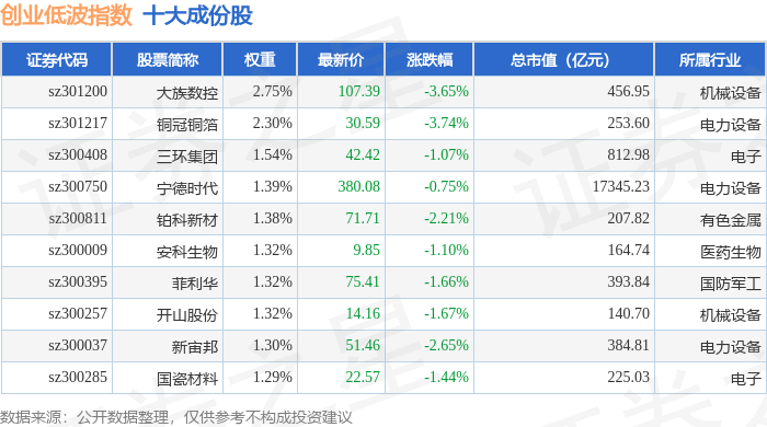 证券之星消息,12月2日,创业低波(399692)指数报收于3797.52点,跌1.26%,成交333.93亿元,换手率1.22%。当日该指数成份股中,上涨的有10家,南大光电以1.86%的涨幅领涨,下跌的有89家,泰格医药以3.88%的跌幅领跌。