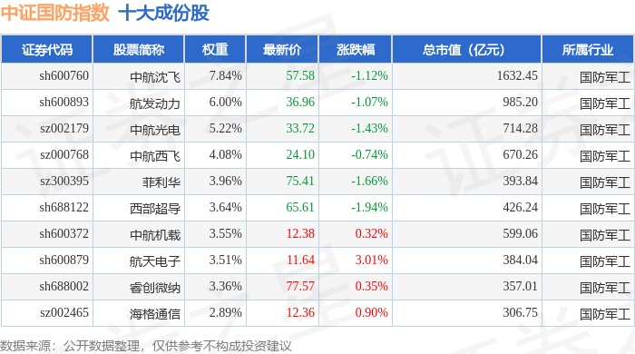 证券之星消息,12月2日,中证国防(399973)指数报收于1596.22点,跌0.58%,成交201.48亿元,换手率1.62%。当日该指数成份股中,上涨的有11家,江航装备以4.57%的涨幅领涨,下跌的有38家,国博电子以2.79%的跌幅领跌。