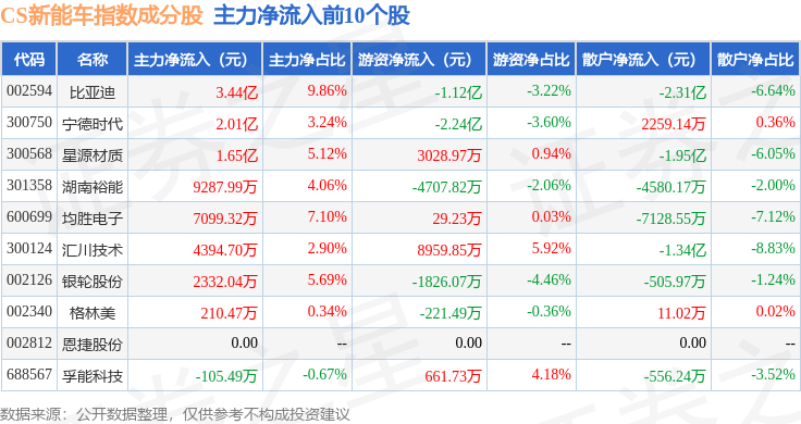 资金流向方面,CS新能车(399976)指数成份股当日主力资金净流出合计39.68亿元,游资资金净流入合计2.65亿元,散户资金净流入合计36.57亿元。成份股资金流向详情见下表: