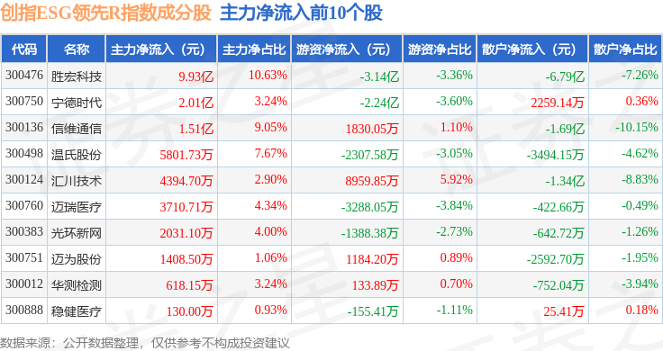 资金流向方面,创指ESG领先R(470031)指数成份股当日主力资金净流出合计20.73亿元,游资资金净流入合计2.77亿元,散户资金净流入合计17.96亿元。成份股资金流向详情见下表: