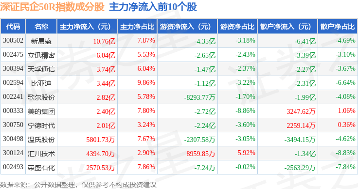 资金流向方面,深证民企50R(470057)指数成份股当日主力资金净流出合计52.08亿元,游资资金净流入合计11.0亿元,散户资金净流入合计41.08亿元。成份股资金流向详情见下表: