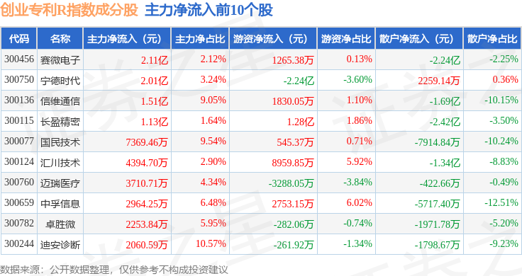 资金流向方面,创业专利R(470068)指数成份股当日主力资金净流出合计7.68亿元,游资资金净流入合计3.28亿元,散户资金净流入合计4.4亿元。成份股资金流向详情见下表: