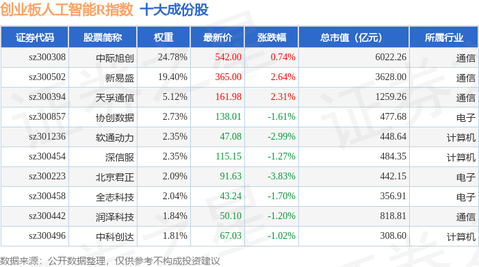创业板人工智能R(470070)指数十大成份股详情如下: