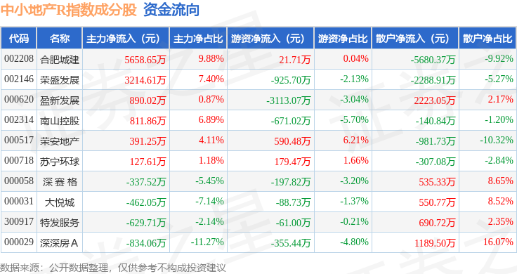 资金流向方面,中小地产R(471002)指数成份股当日主力资金净流入合计8830.67万元,游资资金净流出合计4621.12万元,散户资金净流出合计4209.55万元。成份股资金流向详情见下表: