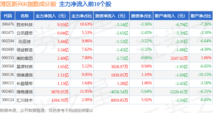 资金流向方面,湾区新兴R(480007)指数成份股当日主力资金净流出合计52.03亿元,游资资金净流入合计13.54亿元,散户资金净流入合计38.49亿元。成份股资金流向详情见下表: