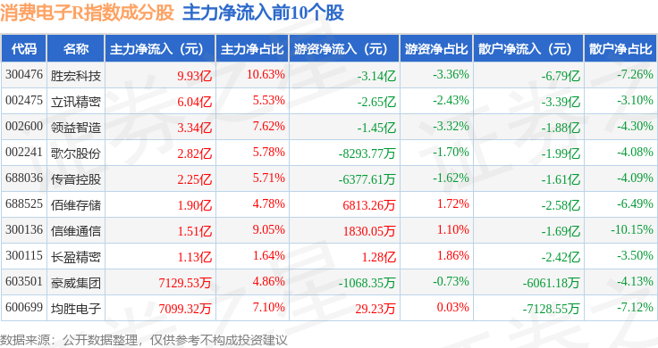 资金流向方面,消费电子R(480030)指数成份股当日主力资金净流入合计5.2亿元,游资资金净流出合计2.48亿元,散户资金净流出合计2.71亿元。成份股资金流向详情见下表: