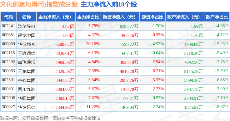 资金流向方面,文化创意R(港币)(480047)指数成份股当日主力资金净流出合计24.04亿元,游资资金净流入合计7.68亿元,散户资金净流入合计16.37亿元。成份股资金流向详情见下表: