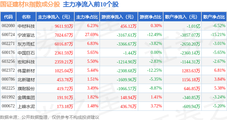 资金流向方面,国证建材R(480048)指数成份股当日主力资金净流入合计1007.66万元,游资资金净流出合计9090.28万元,散户资金净流入合计8082.62万元。成份股资金流向详情见下表: