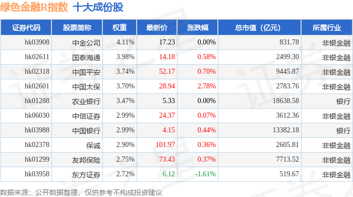 证券之星消息,12月2日,绿色金融R(480052)指数报收于3283.96点,跌0.18%,成交249.73亿元,换手率0.23%。当日该指数成份股中,上涨的有19家,中国太保以2.78%的涨幅领涨,下跌的有27家,三花智控以4.02%的跌幅领跌。