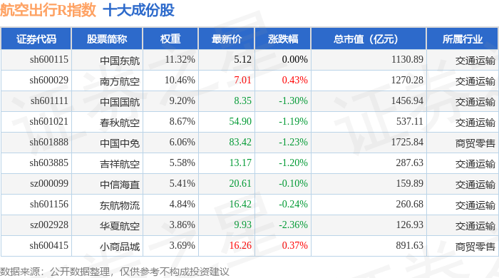 航空出行R(480059)指数十大成份股详情如下: