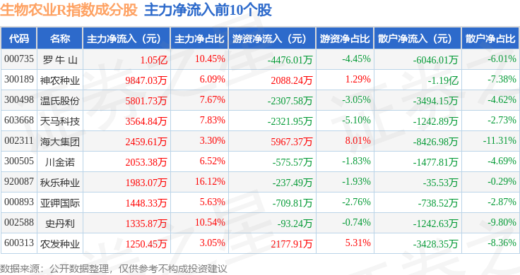 资金流向方面,生物农业R(480072)指数成份股当日主力资金净流出合计6.33亿元,游资资金净流入合计2.84亿元,散户资金净流入合计3.7亿元。成份股资金流向详情见下表: