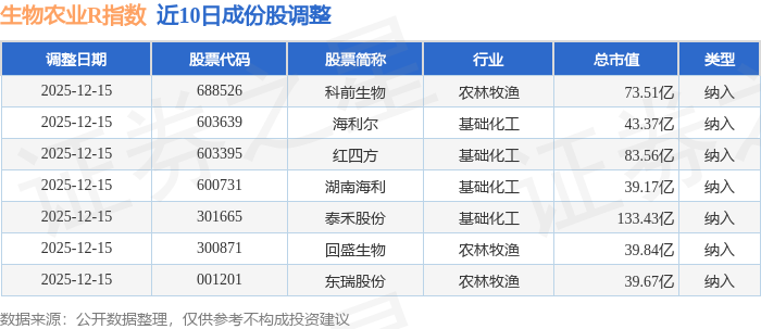近10日内生物农业R(480072)指数成份股做了调整,新纳入了7只股票。