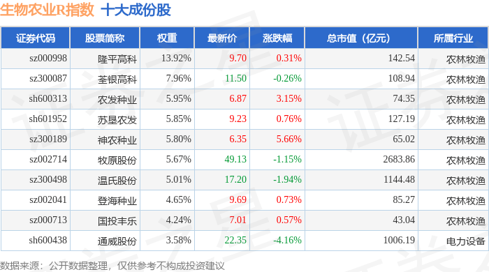 生物农业R(480072)指数十大成份股详情如下: