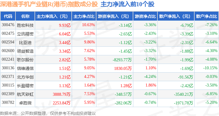 资金流向方面,深港通手机产业链R(港币)(483010)指数成份股当日主力资金净流出合计11.97亿元,游资资金净流入合计3.52亿元,散户资金净流入合计8.44亿元。成份股资金流向详情见下表: