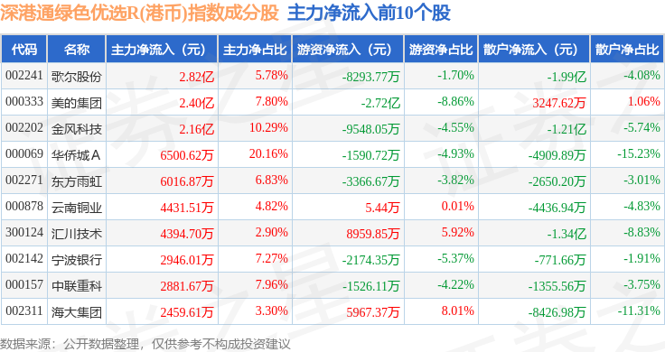 资金流向方面,深港通绿色优选R(港币)(483012)指数成份股当日主力资金净流出合计46.01亿元,游资资金净流入合计14.99亿元,散户资金净流入合计31.03亿元。成份股资金流向详情见下表: