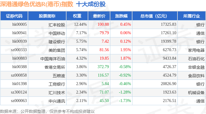 深港通绿色优选R(港币)(483012)指数十大成份股详情如下: